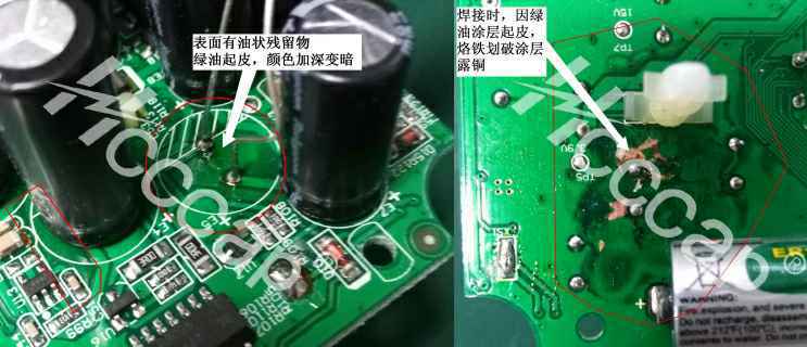 2. 高低电位间距较小的地方,电腐蚀强度更大,反应发生区域PCB走线腐蚀破坏或其他器件受影响失效,整版性能受损。【PCB损坏】