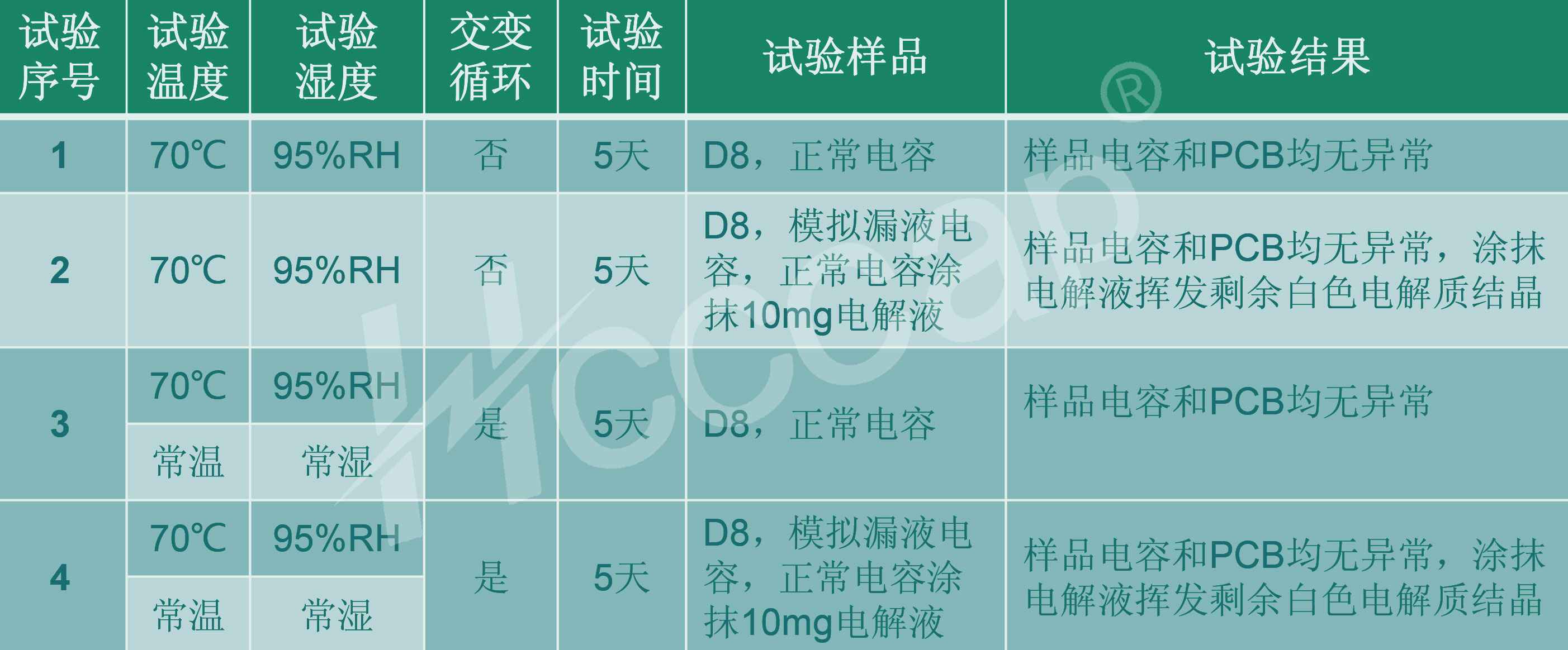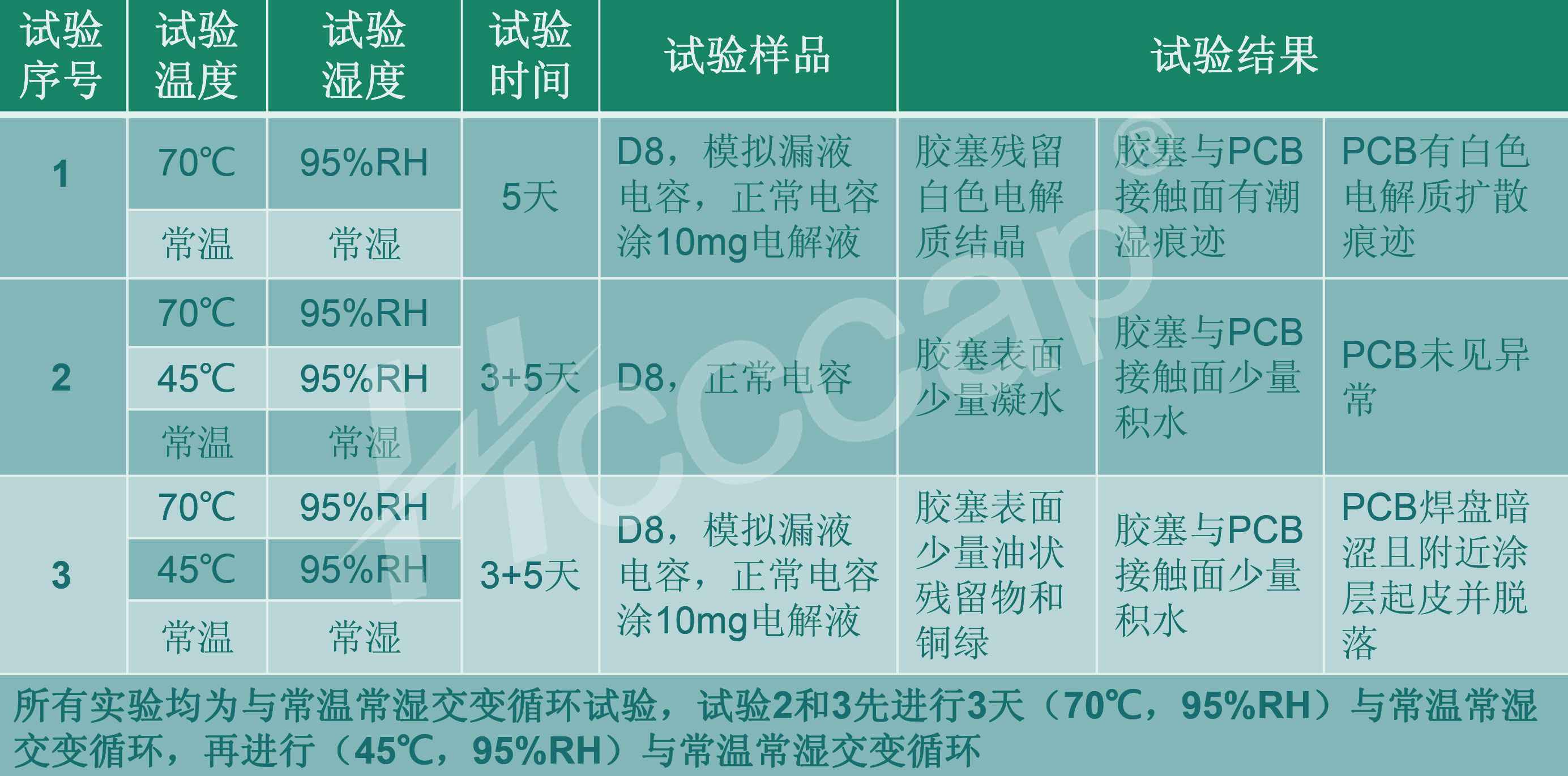 2.无论正常超级电容,还是模拟漏液电容,持续高温高湿(70℃ 95%RH)与常温常湿交变循环短时不会导致电容本身特性或者关联 PCB出现异常;