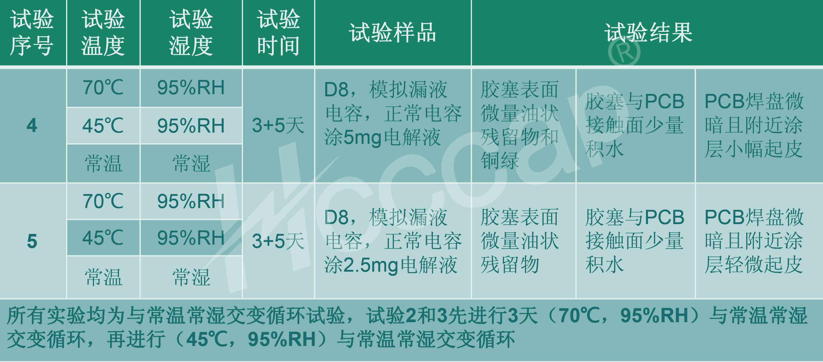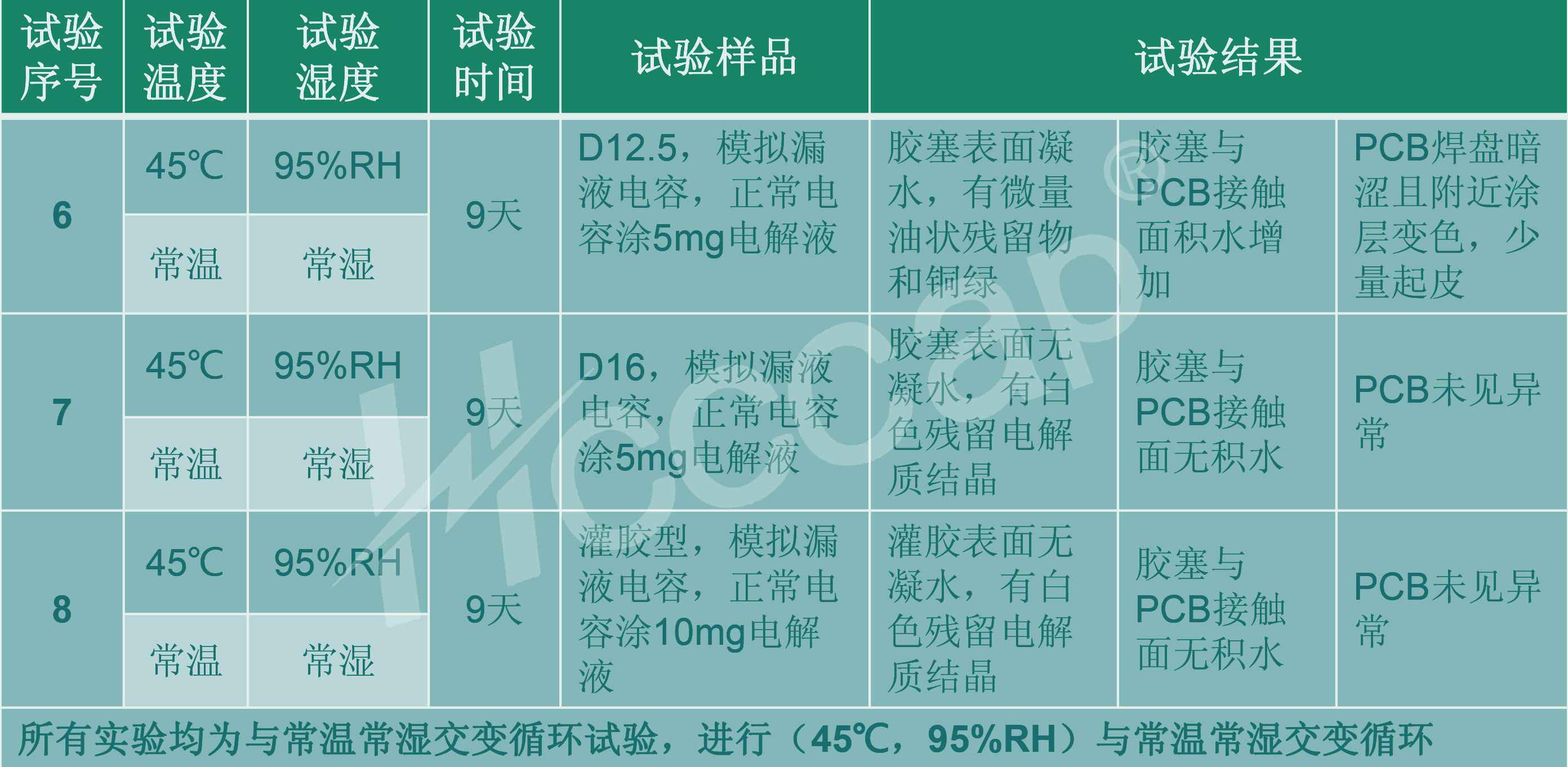 这说明:低温高湿(45℃95%RH)与常温常湿温湿循环,即自然凝 露条件,由于凝露更难以挥发,更容易形成初始腐蚀,更容易引发漏 液现象。